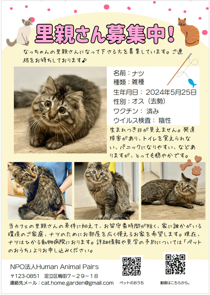 氏名または名称 特定非営利活動法人Human Animal Pairs 理事 霜田ちとせ 事業所の名称 CAT HOME GARDEN 事業所の所在地 東京都足立区足立四丁目14番1号 動物取扱業の種別 展示 登録番号 18東京都展第006207号 登録年月日 平成31年3月5日 有効期間の末日 平成36年3月4日 動物取扱責任者 霜田ちとせ
