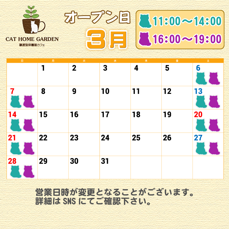 「CAT HOME GARDEN」の今月の営業スケジュールは以下となってます。
