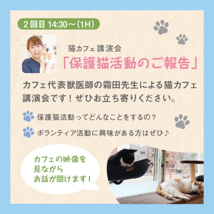 ②14:30〜15:30 猫の保護活動3年間のご報告会、です。