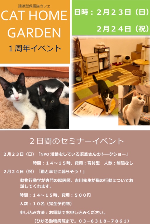 2月の23日(日)と24日(祝日)に「CAT HOME GARDEN」の保護猫カフェ開店1周年を記念したイベントを開催します。