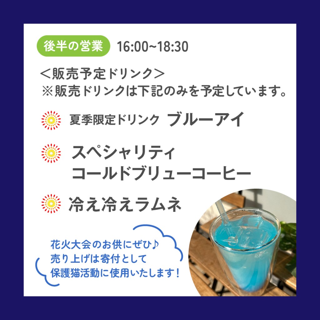 カフェ前でのドリンク販売を行いますので、花火大会のお供にどうぞ♫